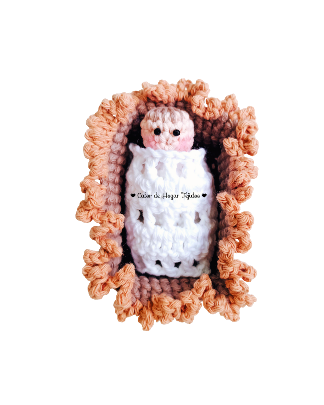 En esta GUÍA DE TEJIDO o patrón de amigurumi navideño aprenderás a tejer a: Jesús en el pesebre. Este proyecto conmemora su nacimiento y es perfecto para hacer como pieza independiente o como parte de la «Corona Navideña» que estamos creando.